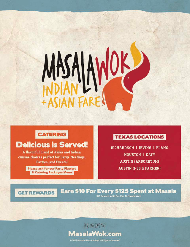 Masala Wok Indian + Asian Fare masterfully blends bold Indian spices with vibrant Asian flavors under one roof in Richardson, TX. Their menu offers a diverse range of dishes that celebrate authentic tastes, from signature Indian platters featuring Tikka Masala, Butter Masala, and Southern Curry to Asian-inspired stir-fries like the Thai Dynamite Box, bursting with fresh Thai basil and green chilies. The thoughtfully crafted sides—such as wok-tossed vegetables in a savory soy sauce, fragrant basmati rice, and cooling raita—perfectly complement the rich entrees.